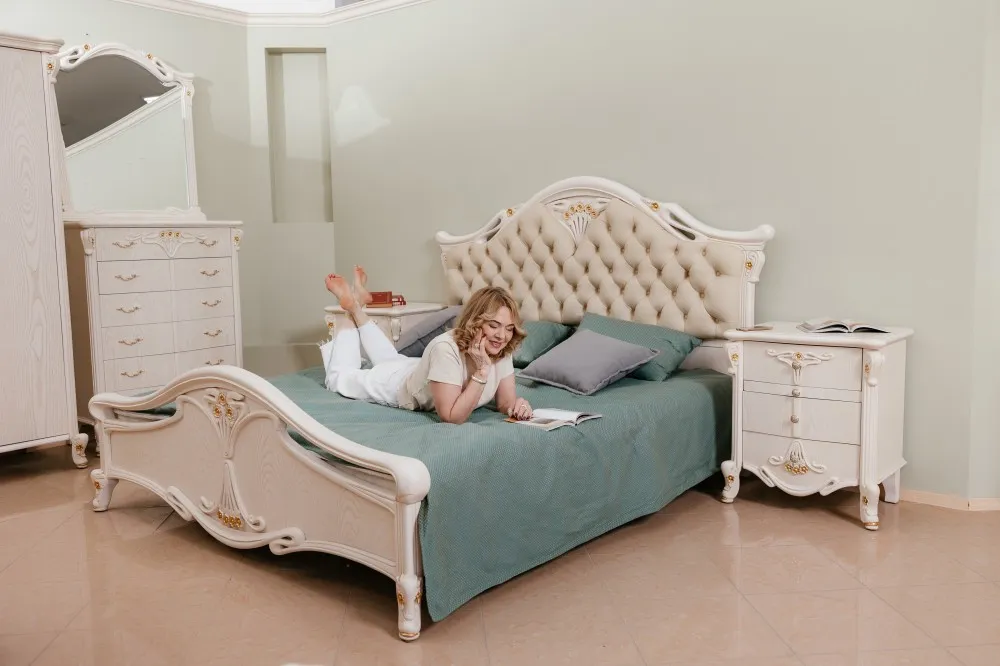 Кровать двуспальная Amelia выполнена в классическом стиле из массива северной березы в шпоне ясеня, покрыта эмалью с нанесением патины. Изголовье декорировано натуральной кожей с каретной стяжкой. Царги из бруса толщиной 30 мм. Усиленное ортопедическое основание с ламелями по технологии 70/30. Глубокий и густой цвет, массивная и элегантная форма, сложная натуральная и экологически чистая мебель Amelia разрабатывалась Миланским дизайн бюро. Вся мебель коллекции выполнена из массива северной березы, в том числе скрытые элементы. Мебель из натурального дерева не выделяет вредных веществ и имеет долгий срок службы. Каждая деталь изделия вырезана вручную, а патина из натурального серебра и изящные линии придают изделиям особенно элегантный и роскошный вид. Дизайн мебели коллекции Amelia исполняется по строгим итальянским технологиям. Разнообразие мебели поможет обустроить любые квадратные метры: гостиную, кухню столовую, кабинет, спальню.