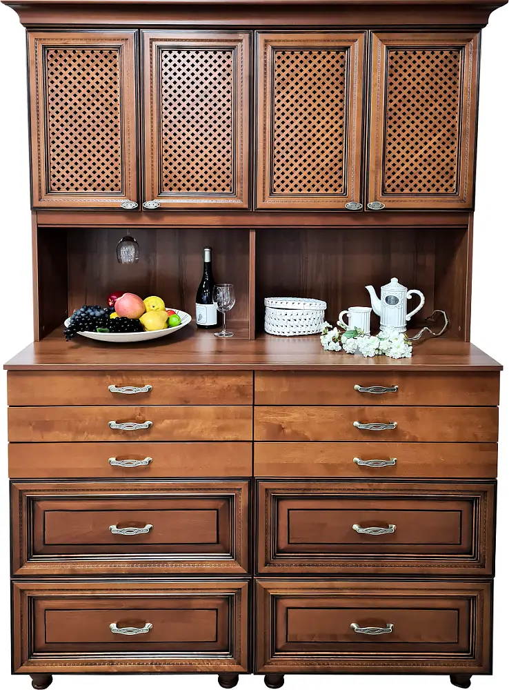 Буфет «Верона» имеет глубокий, благородный цвет, элегантная форма, эстетичная и торжественная мебель, с эффектным и запоминающимся дизайном, станет богатым и почетным украшением домашнего интерьера, наполнив его уютом и практичностью. В верхней секции для хранения посуды дверцы выполнены с перфорированной вставкой, что улучшает воздухообмен внутри шкафа. В нижнем секции располагаются глубокие и вместительные выдвижные ящики. В мебели использована качественная фурнитура европейского качества.