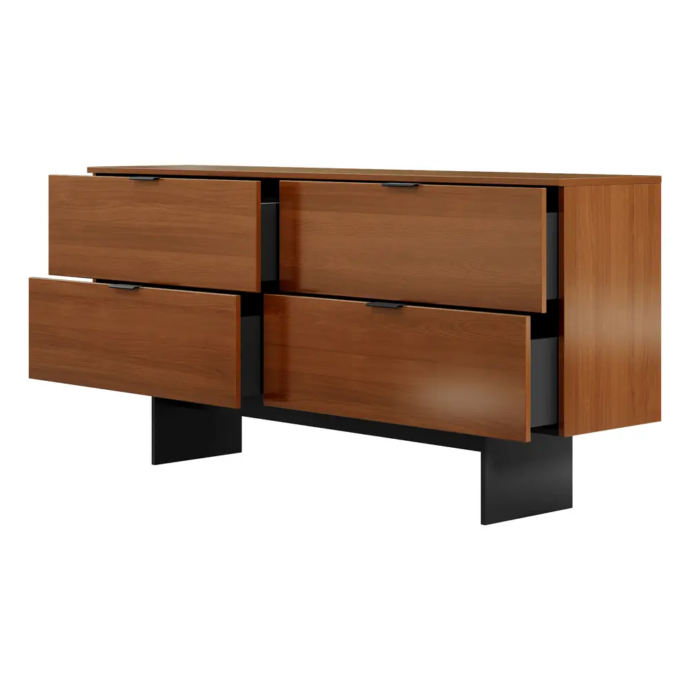 Комод ASPARO в оттенках бренди, пломбир и венге с черными акцентами станет отличным дополнением к современному интерьеру и стилю лофт. Фасады, шпонированные ценными породами дерева, сохраняют текстуру натурального материала. Прямолинейные опоры и черная фурнитура создают строгий и лаконичный образ. Внутренние направляющие скрытого монтажа с доводчиком обеспечивают плавное и бесшумное закрывание ящиков. Четыре просторных ящика идеально подойдут для хранения офисных и кабинетных принадлежностей. Также комод можно использовать как ТВ-тумбу или буфет для хранения посуды.